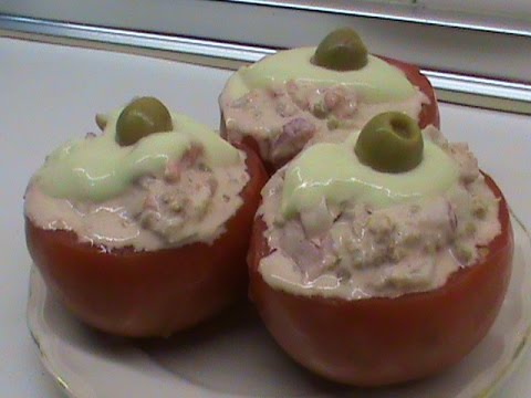 Partimos los tomates a la mitad y vaciamos la parte interna del tomate en un bol, con mucho cuidadito de no romper la parte de fuera. Picamos la cebolla muy picadita, troceamos también las aceitunas, no todas, dejaremos aceitunas enteras para decorar los tomates. En el bol donde tenemos la pulpa del tomate, que también está trocadita, solo nos queda ir mezclando todos los ingredientes, así que ponemos un poquito de cebolla, más o menos por aquí, (un poquito más que a mí me gusta mucho el sabor de la cebolla) ponemos las aceitunas, el atún que también lo hemos desmigado, lo mezclamos todo bien... en esta mezcla añadimos mayonesa, un par de cucharadas de mayonesa, mejor si es casera, hecha por vosotros, removemos y con esto ya tenemos nuestra pasta para rellenar los tomates, que es lo siguiente que tenemos que hacer. Bueno, vamos a hacer la prueba sólo con un tomate, con una cucharita cogemos parte de nuestro relleno y rellenamos abundantemente el tomate. Una vez que está relleno podemos poner un poquito más de mayonesa por encima y darle el toque final con una de nuestras aceitunas. Y este tomatito estaría listo para comer. Eso sí, hasta que lo comamos hay que guardarlo en la nevera. Así que, nada más BUEN PROVECHO